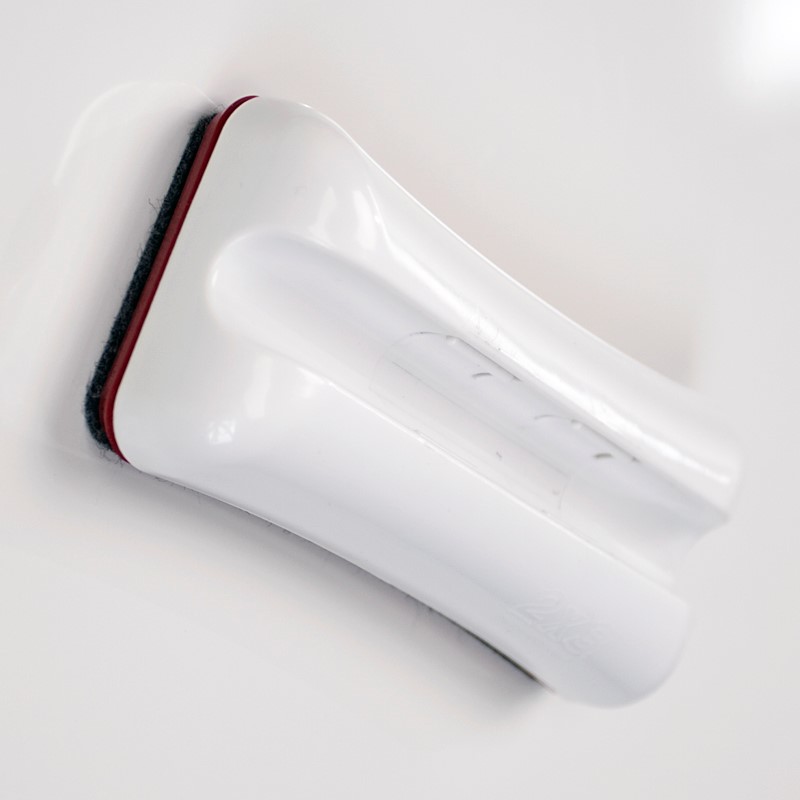 Magnetická stěrka s praktickým uchycením popisovače na tabule, výměnnými filcy a rozšířenou stírací plochou 62 x 150 mm.